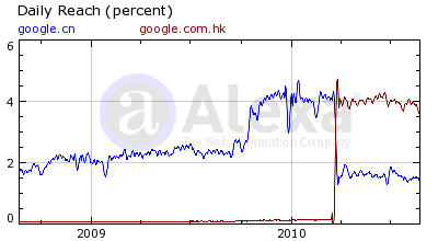我不知道中国到底有多少忠实的Google用户(姑且不算那些一直使用Google.com,从来不用Google.cn的用户),看看下面这张图,Google.cn的失地几乎被Google.com.hk全盘接手,在流量上,Google.com.hk才是.Google.cn的完美继承者,而Google.cn的流量也没有下降到惨不忍睹,只是跌到2008年的水平。