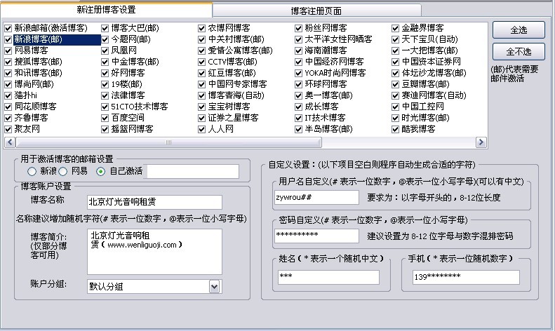 现在高权重的博客一搜索都一大堆,新浪,网易,搜狐,百度等,如果人工手动注册的话,一天下来注册得很累,也比较麻烦,所以我们必须得选一款工具软件来进行批量注册我目前用的是“所立得”这款软件进行批量注册,原本这个是博客群建和群管软件,但现在百度算法调整了,用这类软件做群发博客会被惩罚的。博客批量注册方法相当简单,勾选,然后输入基本信息,输入验证码,点注册就可以了。